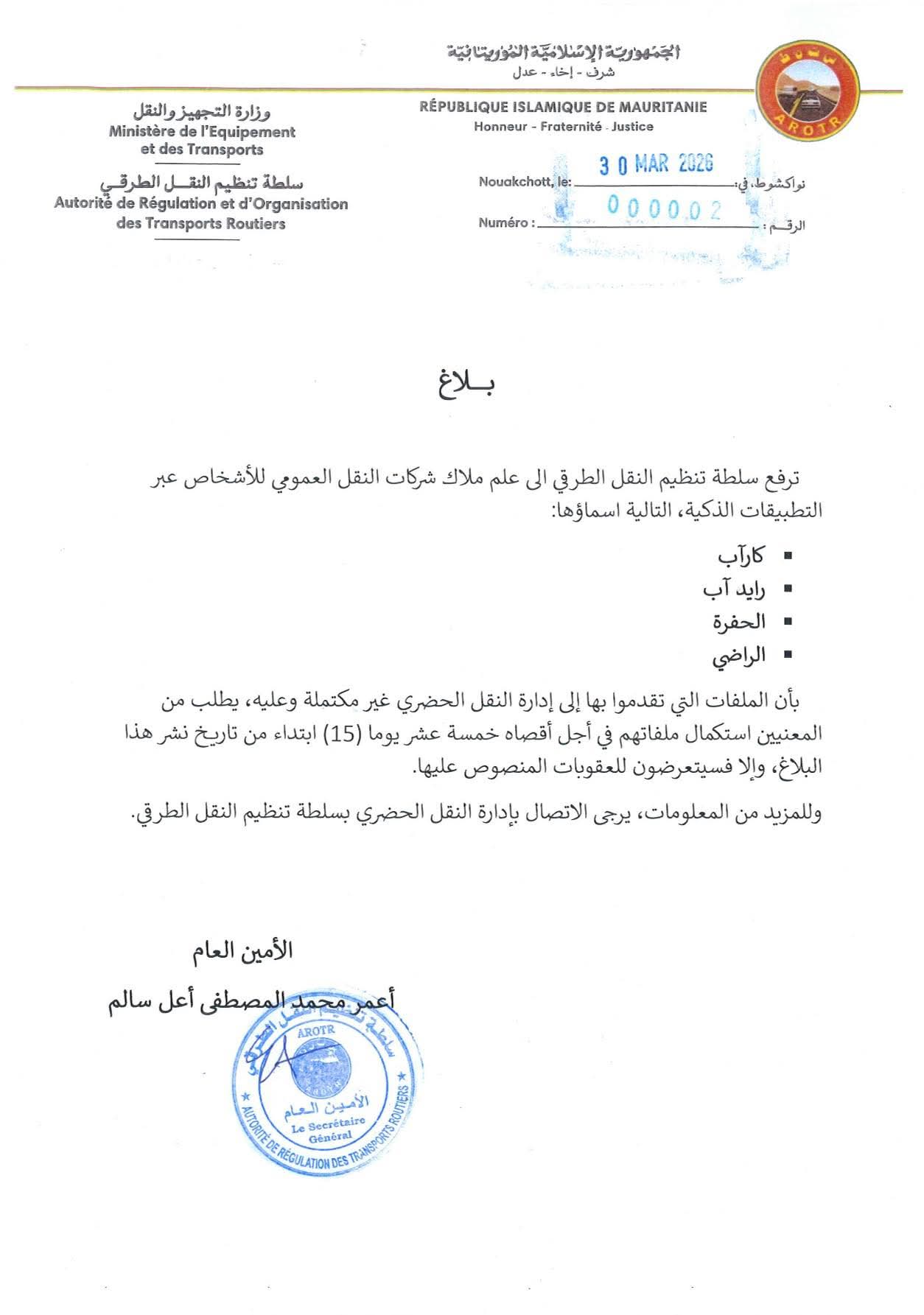 أعلنت سلطة تنظيم النقل الطرقي في موريتانيا عن منح مهلة أقصاها 15 يوماً لشركات النقل العمومي للأشخاص عبر التطبيقات الذكية، من أجل استكمال ملفاتها لدى إدارة النقل الحضري. ويشمل القرار تطبيقات مثل كارب، رايد آب، الحفرة، والراضي.