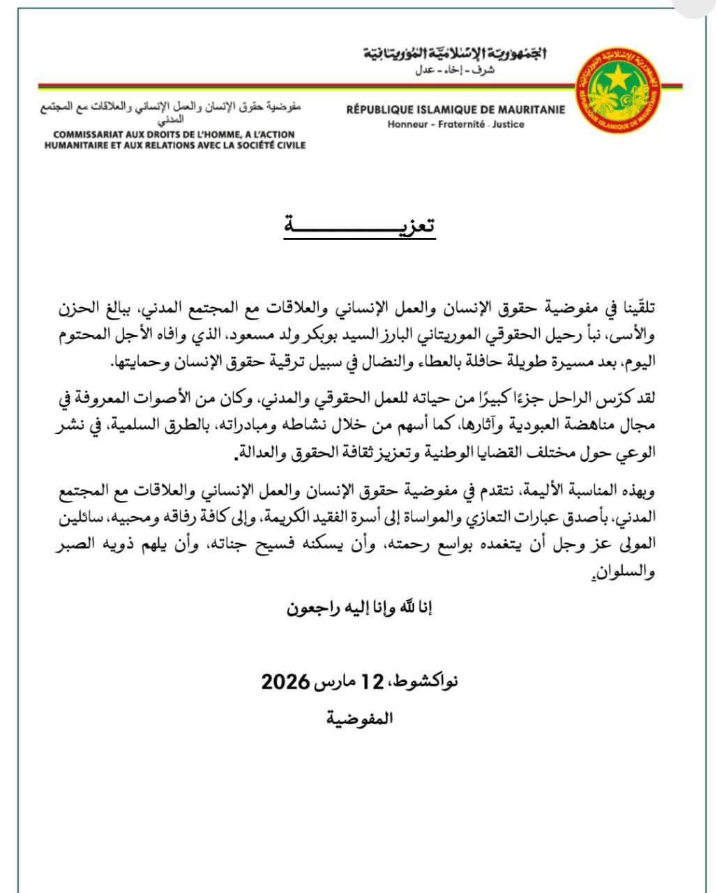 اجتمع مجلس الوزراء اليوم الأربعاء 11 مارس 2026، تحت رئاسة صاحب الفخامة السيد محمد ولد الشيخ الغزواني، رئيس الجمهورية.