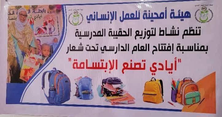 وزّعت هيئة "ام حينه للعمل الإنساني" صباح اليوم الخميس 100 حقيبة مدرسية على أبناء الأسر الهشة المسجلين لديها، ضمن برنامجها الخيري السنوي الذي دأبت على تنظيمه مع انطلاقة كل عام دراسي.
