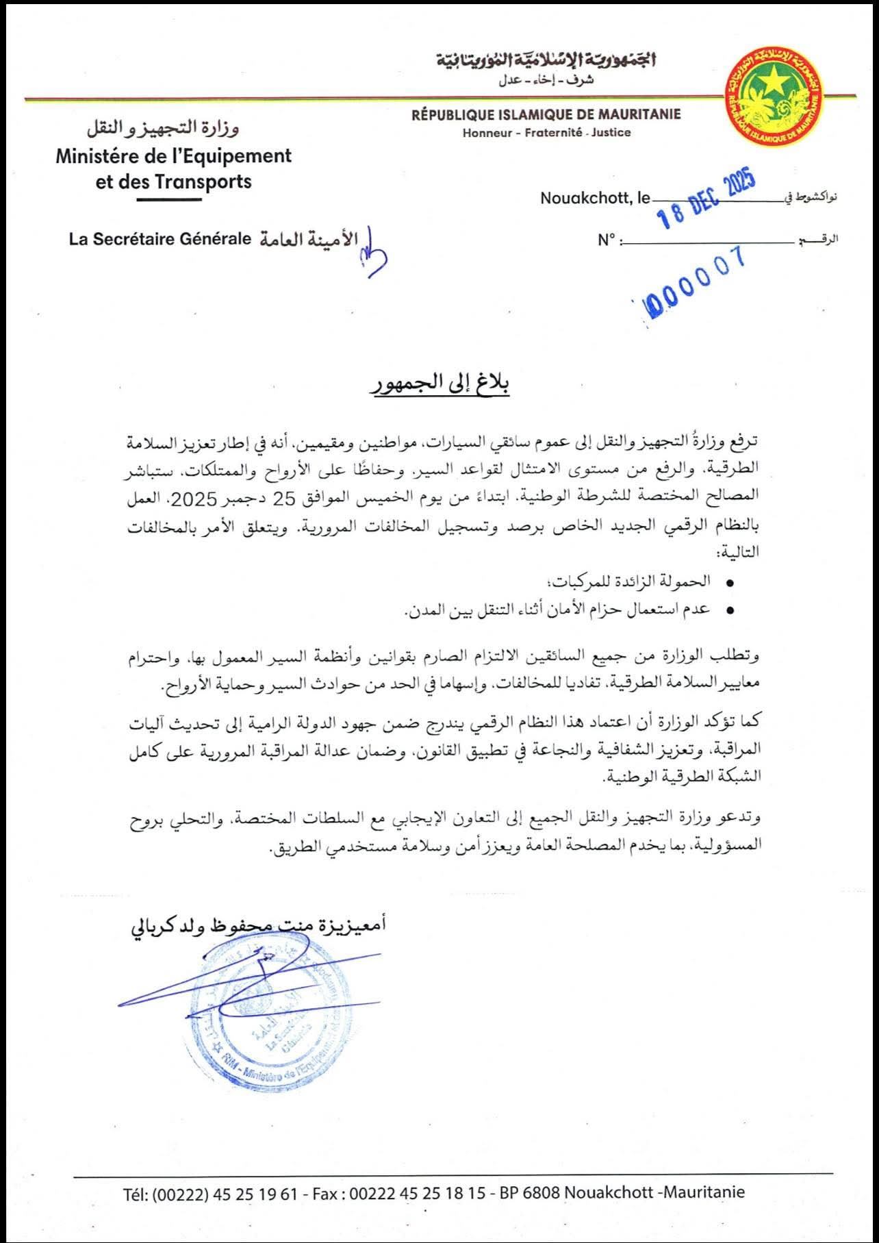 أعلنت وزارة التجهيز والنقل شروع المصالح المختصة في الشرطة الوطنية، ابتداءً من يوم الخميس 25 ديسمبر 2025، في العمل بنظام رقمي جديد لرصد وتسجيل المخالفات المرورية، وذلك في إطار تعزيز السلامة الطرقية والرفع من مستوى الالتزام بقواعد السير.