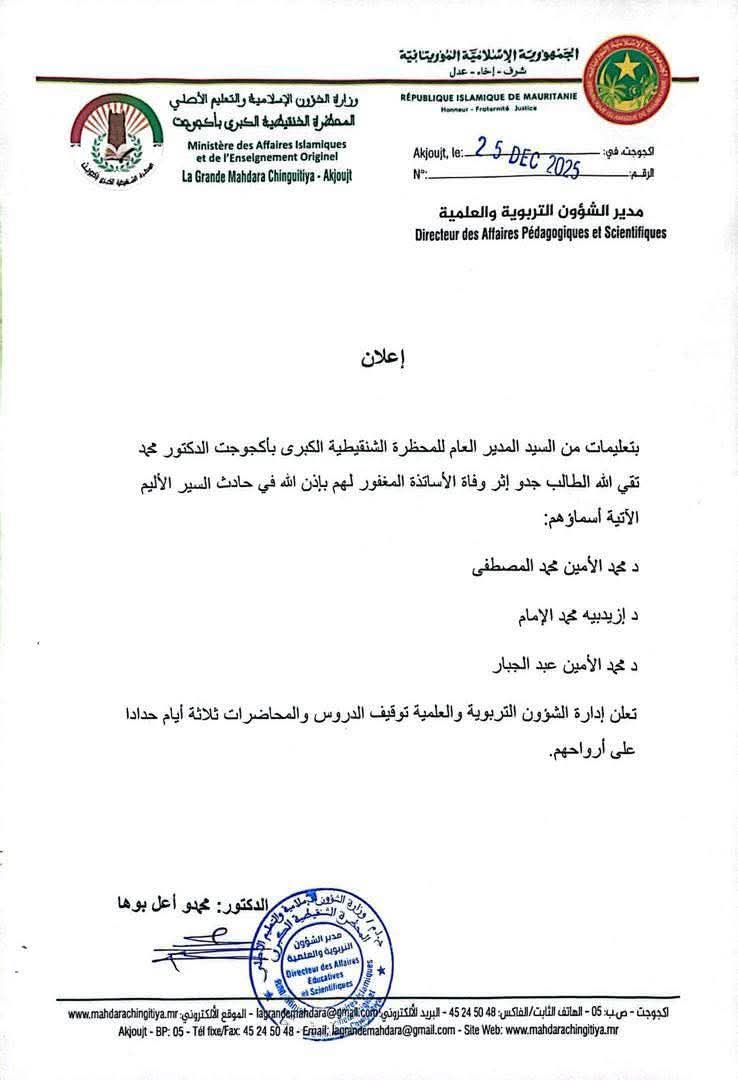 أعلنت إدارة الشؤون التربوية والعلمية بالمحضرة الشنقيطية الكبرى في أكجوجت تعليق الدروس والمحاضرات لمدة ثلاثة أيام، وذلك حدادًا على وفاة ثلاثة من أساتذة المحضرة في حادث سير أليم.