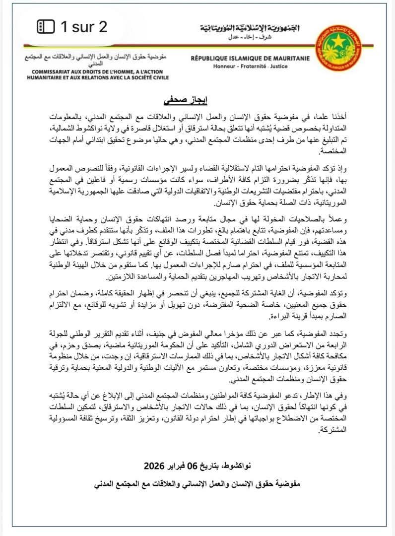 أعلنت مفوضية حقوق الإنسان والعمل الإنساني والعلاقات مع المجتمع المدني متابعتها لما تم تداوله من معلومات بشأن قضية يُشتبه في تعلقها بحالة استرقاق أو استغلال قاصرة في ولاية نواكشوط الشمالية، تم التبليغ عنها من طرف إحدى منظمات المجتمع المدني، وهي حالياً قيد تحقيق ابتدائي لدى الجهات القضائية المختصة.