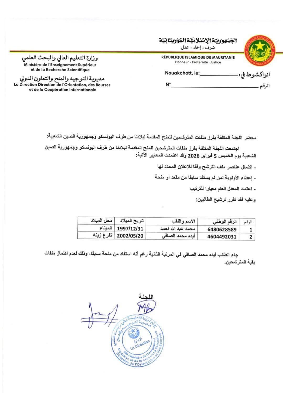 عقدت اللجنة المكلفة بفرز ملفات المترشحين للمنح المقدمة لموريتانيا من طرف اليونسكو وجمهورية الصين الشعبية اجتماعها يوم الخميس 5 فبراير 2026، وذلك بمقر وزارة التعليم العالي والبحث العلمي في نواكشوط.