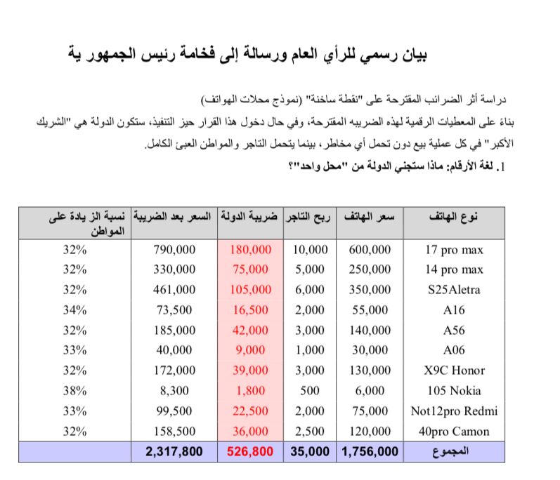 كما حذر من أن الضرائب الجديدة قد تؤدي إلى ارتفاع أسعار الهواتف بنسبة تصل إلى 32%، ما قد يضعف القدرة الشرائية للمواطنين ويجعل اقتناء الهاتف أو استبداله أكثر صعوبة لذوي الدخل المحدود.