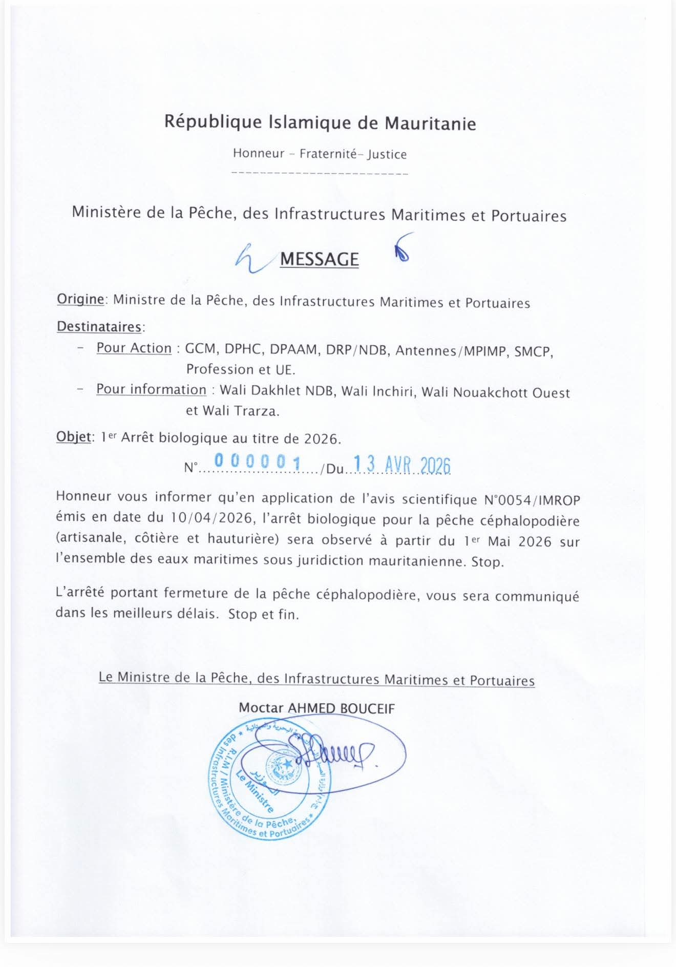 ويأتي هذا القرار استنادًا إلى توصيات الرأي العلمي رقم 0054 الصادر عن المعهد الموريتاني لبحوث المحيطات والصيد بتاريخ 10 أبريل 2026، والذي شدّد على ضرورة اعتماد فترة راحة بيولوجية لضمان تجدد المخزون السمكي والحفاظ على استدامة الموارد البحرية.