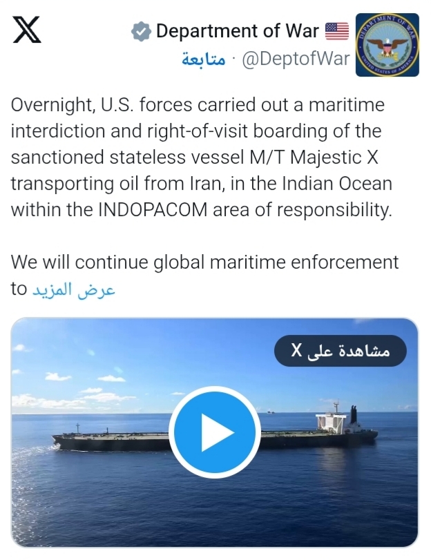 وقالت وزارة الحرب الأميركية إنها سيطرت على ناقلة النفط «ماجيستك إكس» في المحيط الهندي، وفقاً لما ذكرته وكالة «أسوشييتد برس» الأميركية.