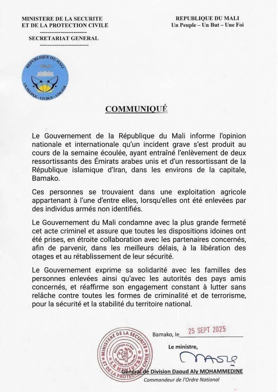 أعلنت الحكومة المالية، اليوم الخميس، اختطاف ثلاثة أشخاص بينهم مواطنان من الإمارات وآخر من إيران، على أطراف العاصمة باماكو خلال الأسبوع الماضي.