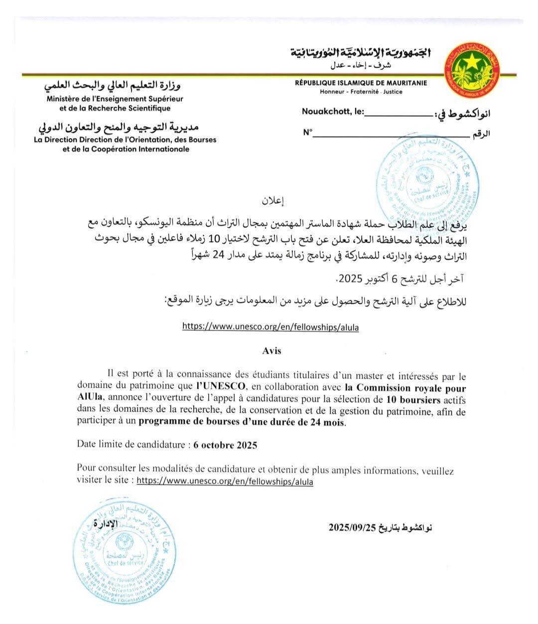 أعلنت وزارة التعليم العالي والبحث العلمي، بالتعاون مع منظمة اليونسكو والهيئة الملكية لمحافظة العلا، عن فتح باب الترشح أمام حملة الماستر المهتمين بمجال التراث لاختيار 10 باحثين للمشاركة في برنامج زمالة يمتد على مدى 24 شهراً في مجالات بحوث التراث وصونه وإدارته.