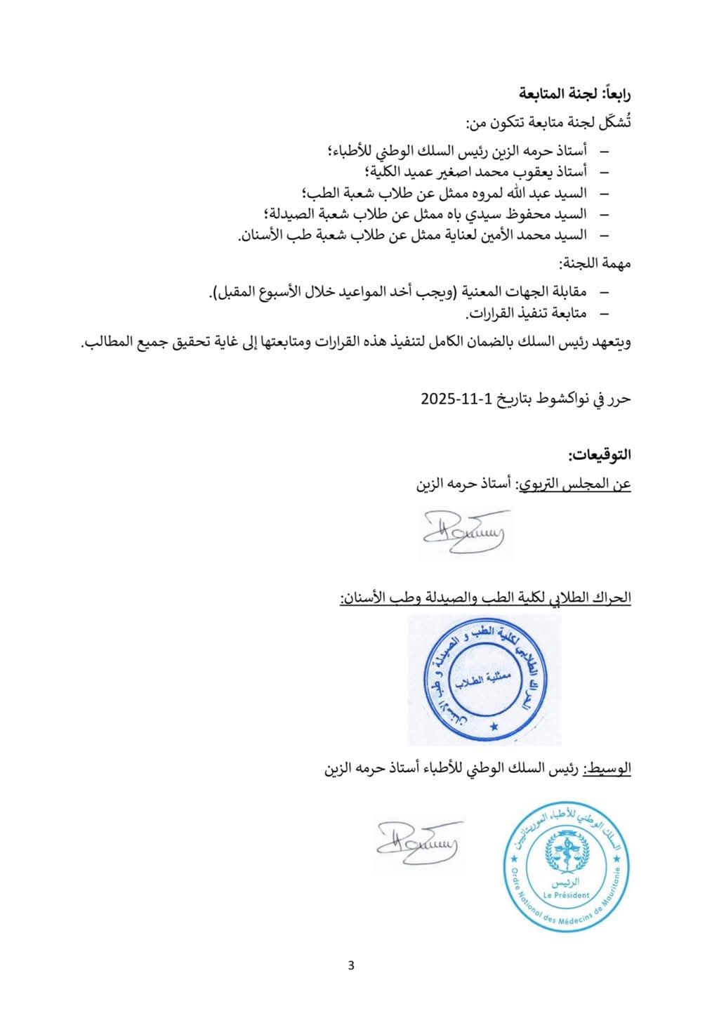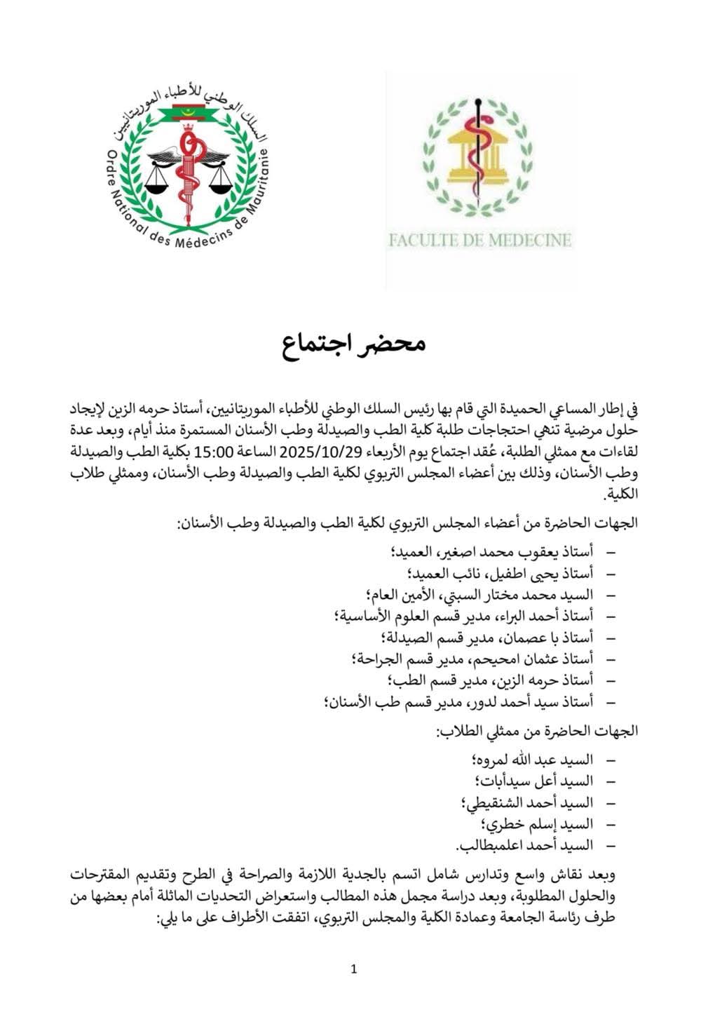 توصلت كلية الطب والصيدلة وطب الأسنان بجامعة نواكشوط إلى اتفاق مع ممثلي طلابها أنهى الإضراب المستمر منذ أيام، وذلك بوساطة رئيس السلك الوطني للأطباء الموريتانيين.