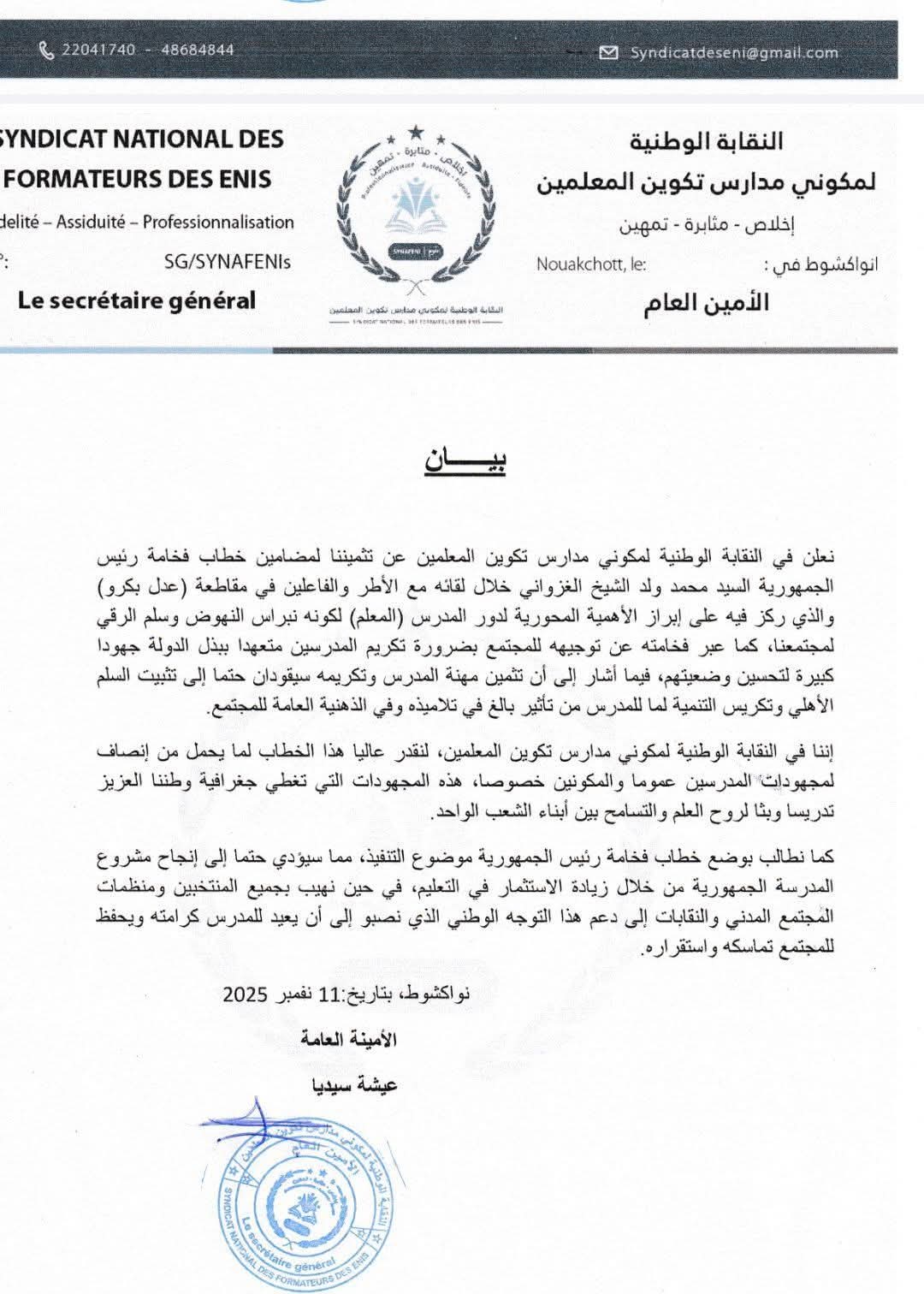 وصدر البيان عن الأمينة العامة للنقابة السيدة عيشة سيديا بتاريخ 11 نوفمبر 2025.
