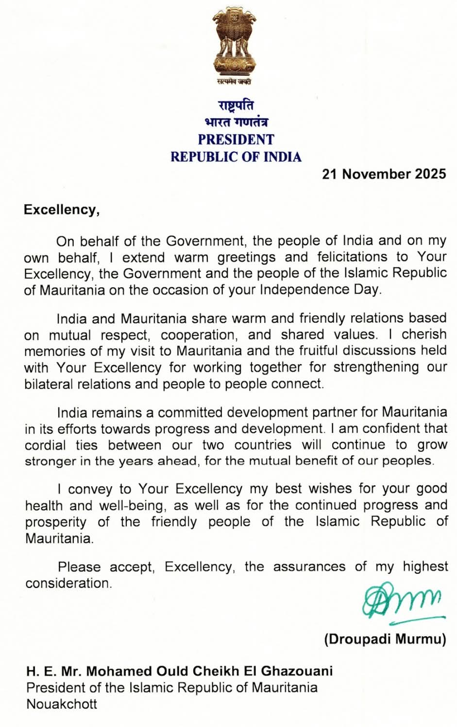 وأعربت الرئيسة في رسالتها عن تقديرها للروابط المتنامية بين الهند وموريتانيا، مشيرة إلى ذكريات زيارتها السابقة لنواكشوط وما شهدته من نقاشات مثمرة لتعزيز العلاقات الثنائية والتواصل بين الشعبين.