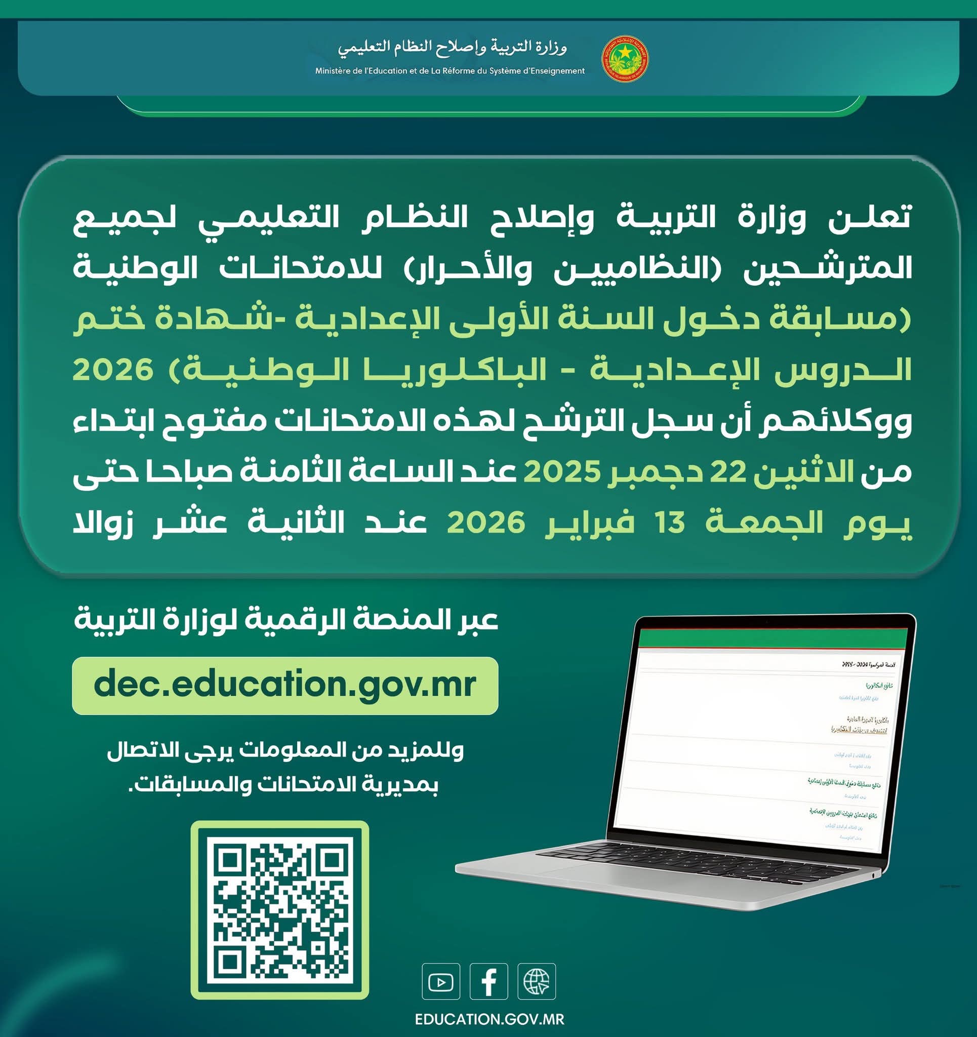 أعلنت وزارة التربية وإصلاح النظام التعليمي فتح باب الترشح للامتحانات الوطنية لسنة 2026، لصالح جميع المترشحين النظاميين والأحرار، وتشمل مسابقة دخول السنة الأولى الإعدادية، وشهادة ختم الدروس الإعدادية، والبكالوريا الوطنية.