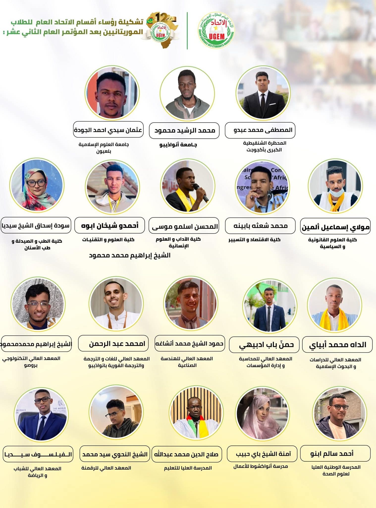 أعلن الاتحاد العام للطلاب الموريتانيين، عقب تنظيم مؤتمره العام الثاني عشر، عن قائمة رؤساء أقسامه في مختلف مؤسسات التعليم العالي في البلاد، وذلك استنادًا إلى النظامين الأساسي والداخلي للاتحاد.