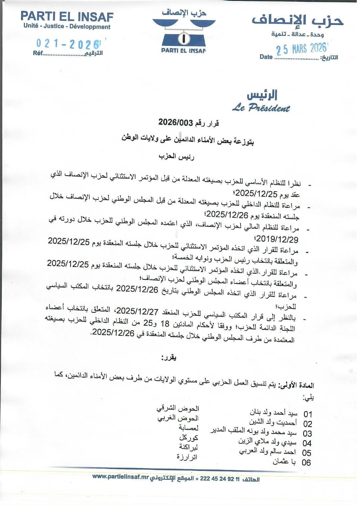 أصدر رئيس حزب الإنصاف، بتاريخ 25 مارس 2026، القرار رقم 2026/003، القاضي بتوزيع عدد من الأعضاء الدائمين للإشراف على تنسيق العمل الحزبي في مختلف ولايات الوطن.