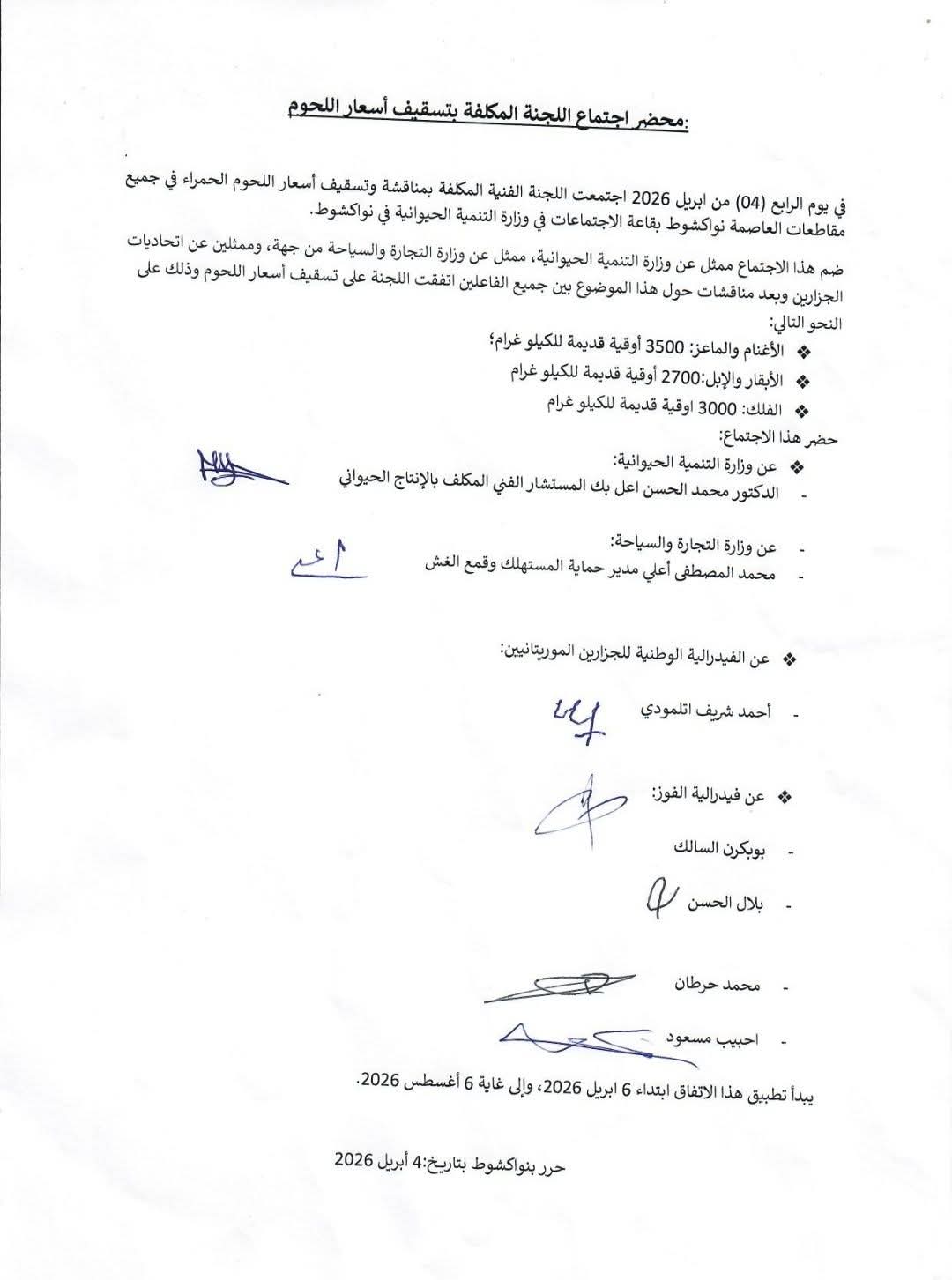 أعلن زوال اليوم السبت، في مباني وزارة التنمية الحيوانية بالعاصمة نواكشوط، عن اعتماد تسقيف لأسعار اللحوم الحمراء، سيبدأ العمل به  الإثنين 6 إبريل الجاري، ويعتمد مبلغ 3500 أوقية قديمة كسعر ثابت لكيلوغرام لحم الضأن وللماعز ، و 2700 أوقية قديمة لكيلوغرام لحم الإبل والبقر، في حين يحدد 3000 أوقية قديمة كسعر لكلوغرام الفلكه.
