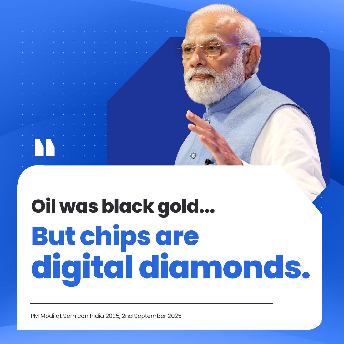 سلّط رئيس الوزراء الضوء على أهمية صناعة أشباه الموصلات، واصفًا الرقائق الإلكترونية بـ"الماس الرقمي" للقرن الحادي والعشرين، قائلًا إن السوق العالمية لأشباه الموصلات ستتجاوز تريليون دولار قريبًا، وإن الهند تسير بخطى ثابتة للحصول على حصة كبيرة منها.