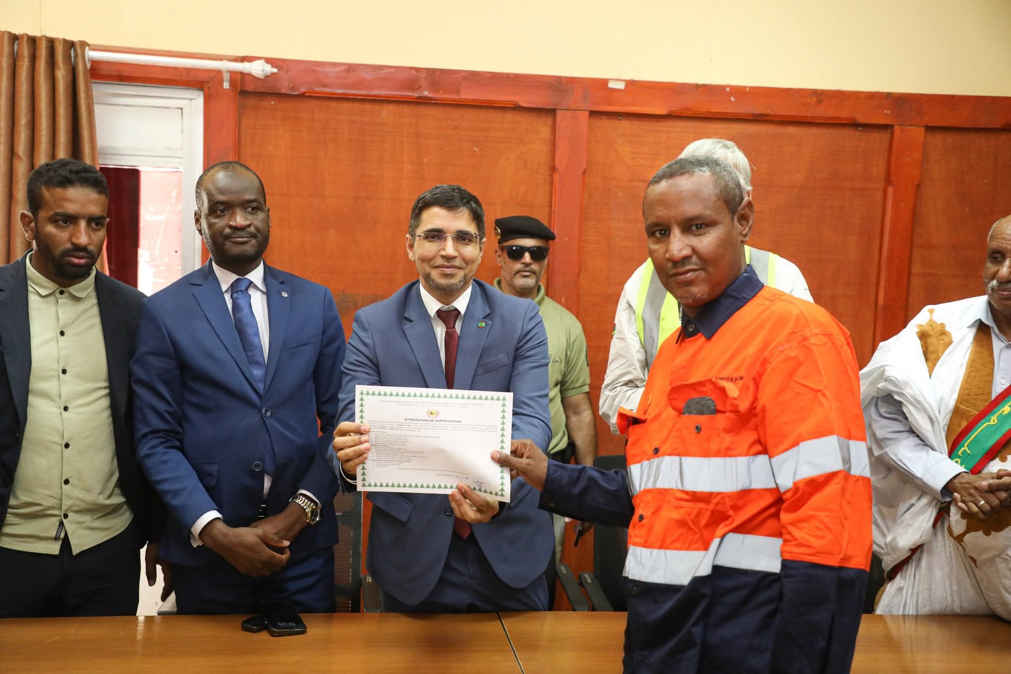 أشرف وزير تمكين الشباب والتشغيل والرياضة والخدمة المدنية، السيد محمد عبد الله لولي، صباح اليوم الجمعة 12 سبتمبر 2025، بمدينة أكجوجت، على حفل توزيع إفادات الاعتماد المهني لصالح 400 فني، وذلك بالشراكة مع شركة نحاس موريتانيا (MCM) والإدارة العامة للتشغيل.