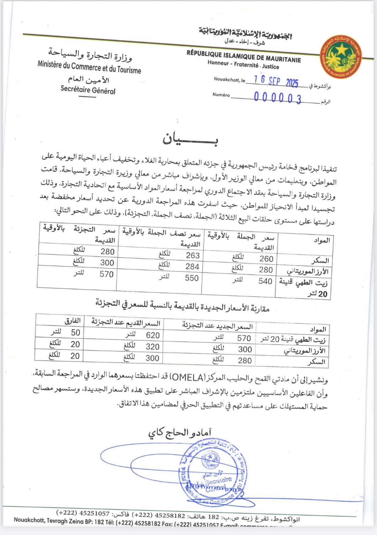 الأسعار الجديدة تعكس انخفاضاً بـ50 أوقية قديمة في سعر الزيت و20 أوقية قديمة لكل من السكر والأرز. وأكدت الوزيرة أن هذا القرار يأتي استجابة لتوجيهات رئيس الجمهورية، وسيظل سارياً حتى يناير 2026.