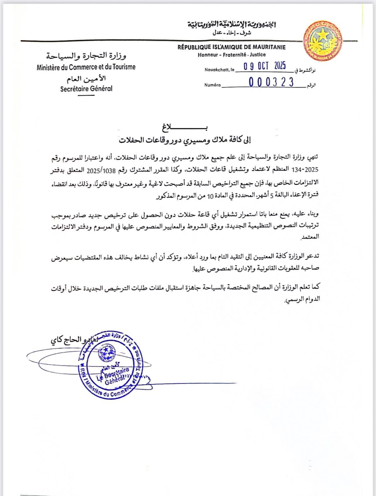 أعلنت وزارة التجارة والسياحة الموريتانية، في بلاغ أصدرته يوم 9 أكتوبر 2025، عن إلزام جميع ملاك وأصحاب دور ومسارح وقاعات الحفلات، الحاصلين على تراخيص سابقة، بتجديد ترخيصاتهم خلال مهلة أقصاها خمسة أشهر، وأوضحت أن التراخيص الصادرة سابقًا التي لم تُجدَّد ستُعتبر لاغية وغير معترف بها قانونياً بعد انتهاء تلك المهلة.