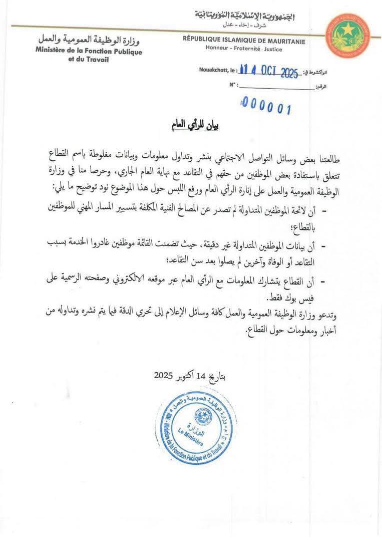 أصدرت وزارة الوظيفة العمومية والعمل في موريتانيا بيانا رسميا اليوم، الأحد 14 أكتوبر 2025، ردا على ما تم تداوله عبر وسائل التواصل الاجتماعي ووسائل الإعلام من معلومات وبيانات مغلوطة حول استفادة بعض الموظفين من حقوقهم التقاعدية.