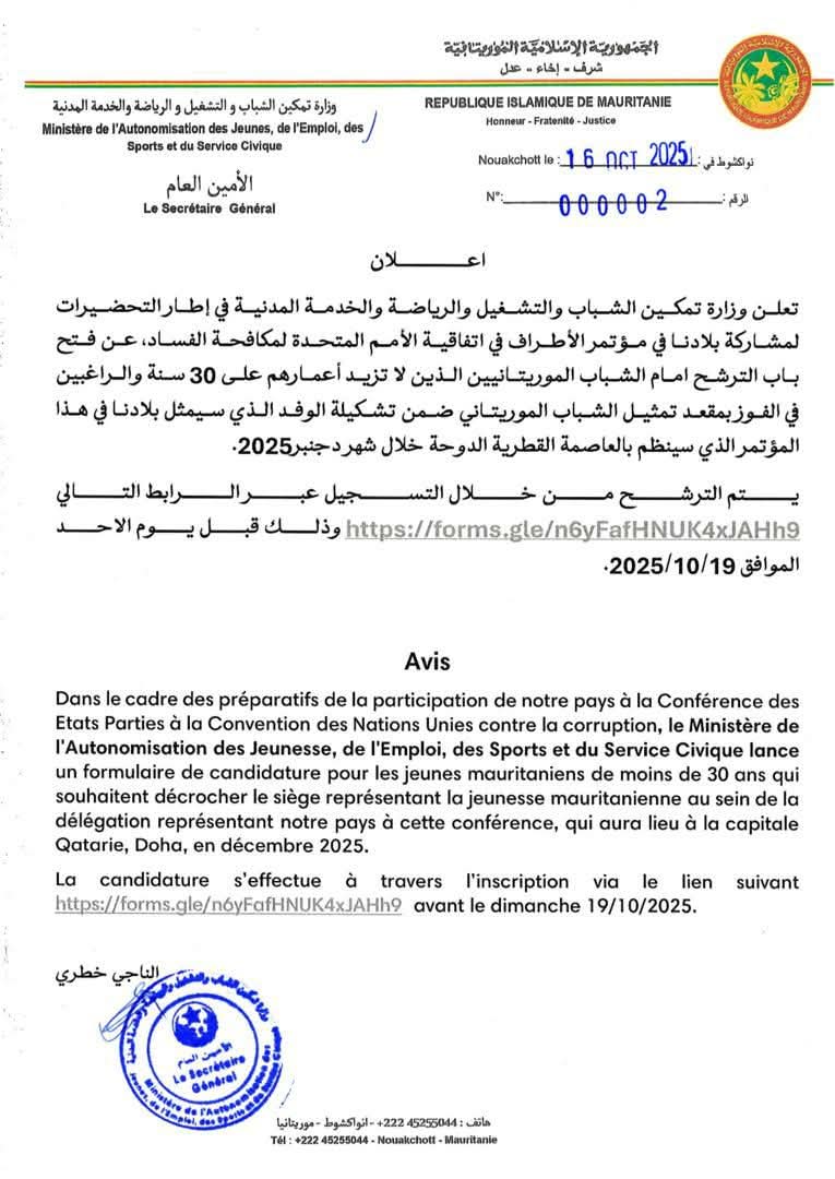أعلنت وزارة تمكين الشباب والتشغيل والرياضة والخدمة المدنية عن فتح باب الترشح أمام الشباب الموريتانيين الذين لا تتجاوز أعمارهم 30 سنة، لتمثيل موريتانيا في مؤتمر الدول الأطراف في اتفاقية الأمم المتحدة لمكافحة الفساد، والذي سيُعقد في العاصمة القطرية الدوحة خلال ديسمبر 2025.