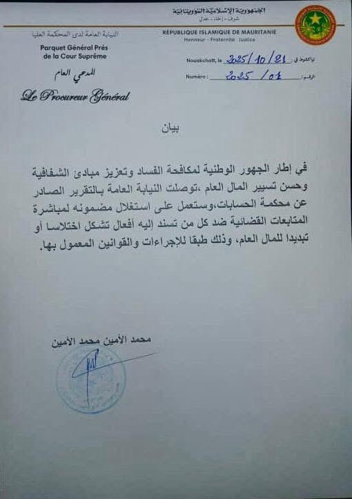 أعلنت النيابة العامة لدى المحكمة العليا في موريتانيا أنها تواصل التحقيق في البلاغات الصادرة بشأن وجود شبهات تتعلق باستغلال ممتلكات الدولة، وذلك في إطار الجهود الوطنية لمكافحة الفساد وتعزيز الشفافية وحسن تسيير المال العام.