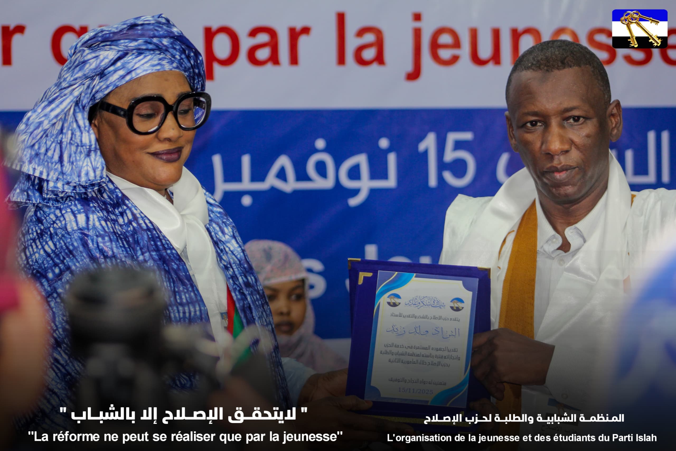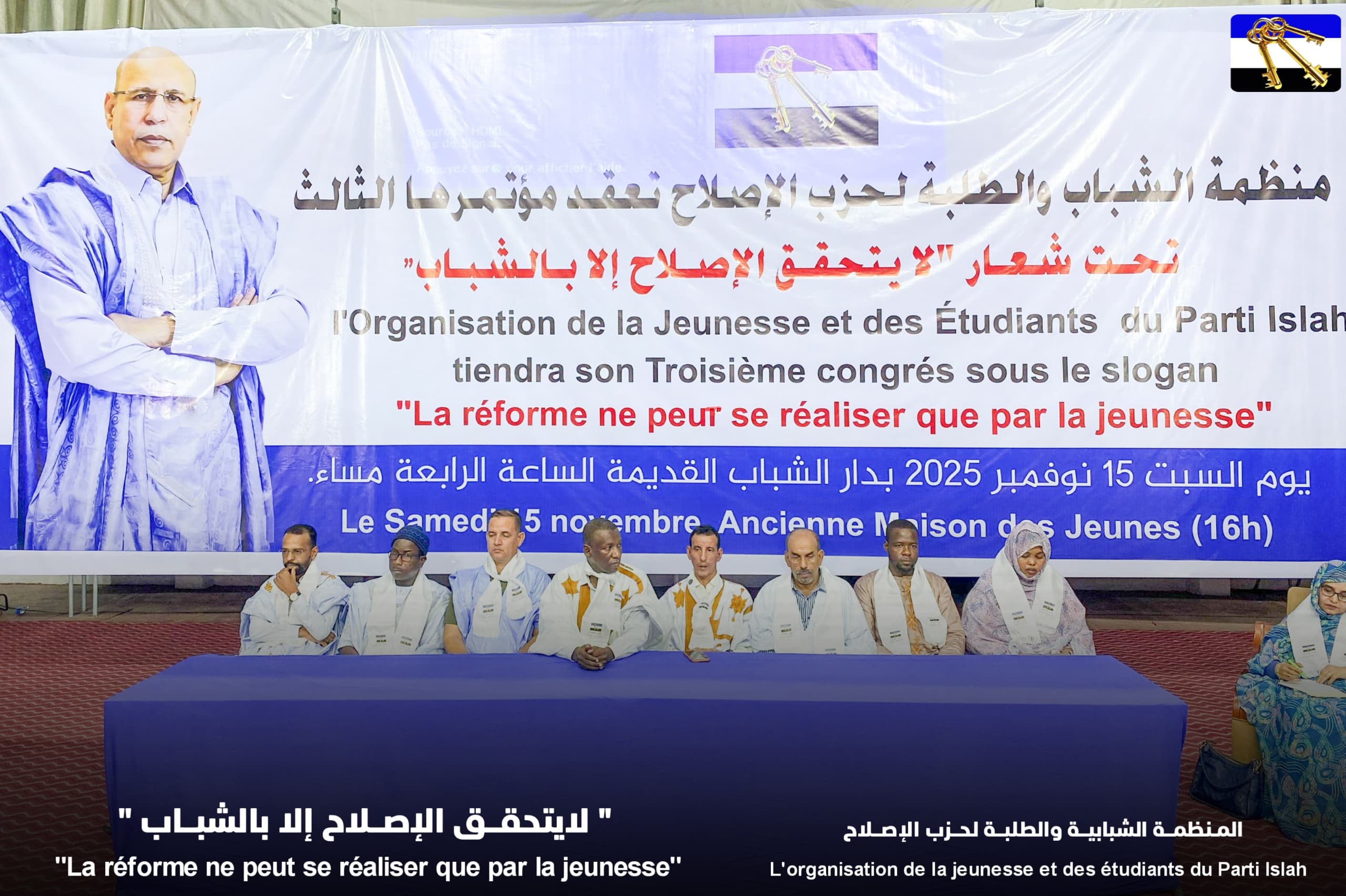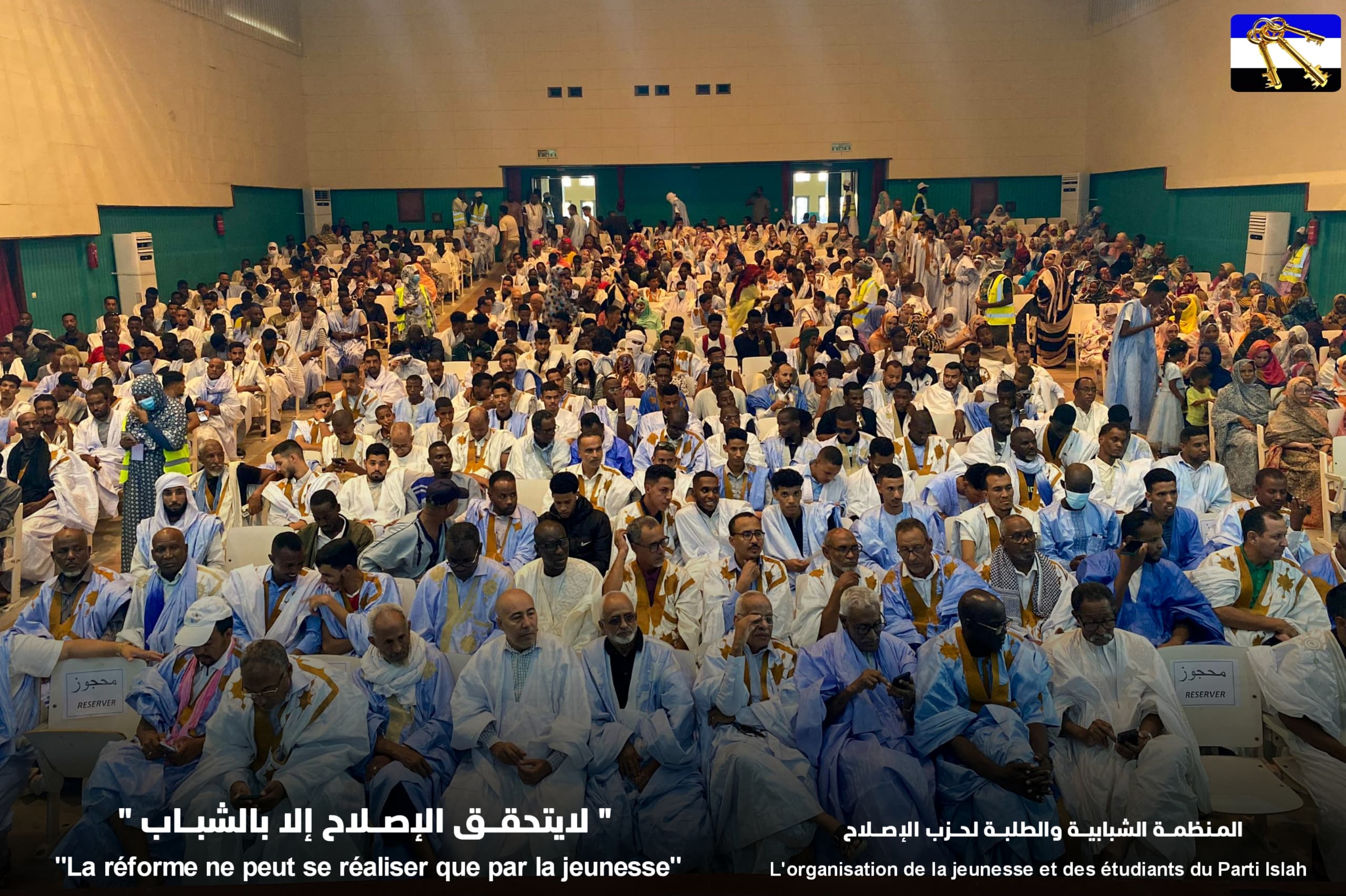 عقدت منظمة الشباب والطلبة بحزب الإصلاح، مساء السبت 15 نوفمبر 2025، مؤتمرها الثالث بدار الشباب القديمة، تحت شعار: "لا يتحقق الإصلاح إلا بالشباب"، وذلك بحضور رئيس الحزب النائب محمد ولد طالبن، والأمينة العامة الوزيرة مسعودة بحام محمد لغظف، ونائبة الرئيس النائب مريم وان، إلى جانب ممثلين عن عدد من المنظمات الشبابية الوطنية، وممثلين عن حزب حركة النضال الوطني في تونس وحركة حماس الفلسطينية.