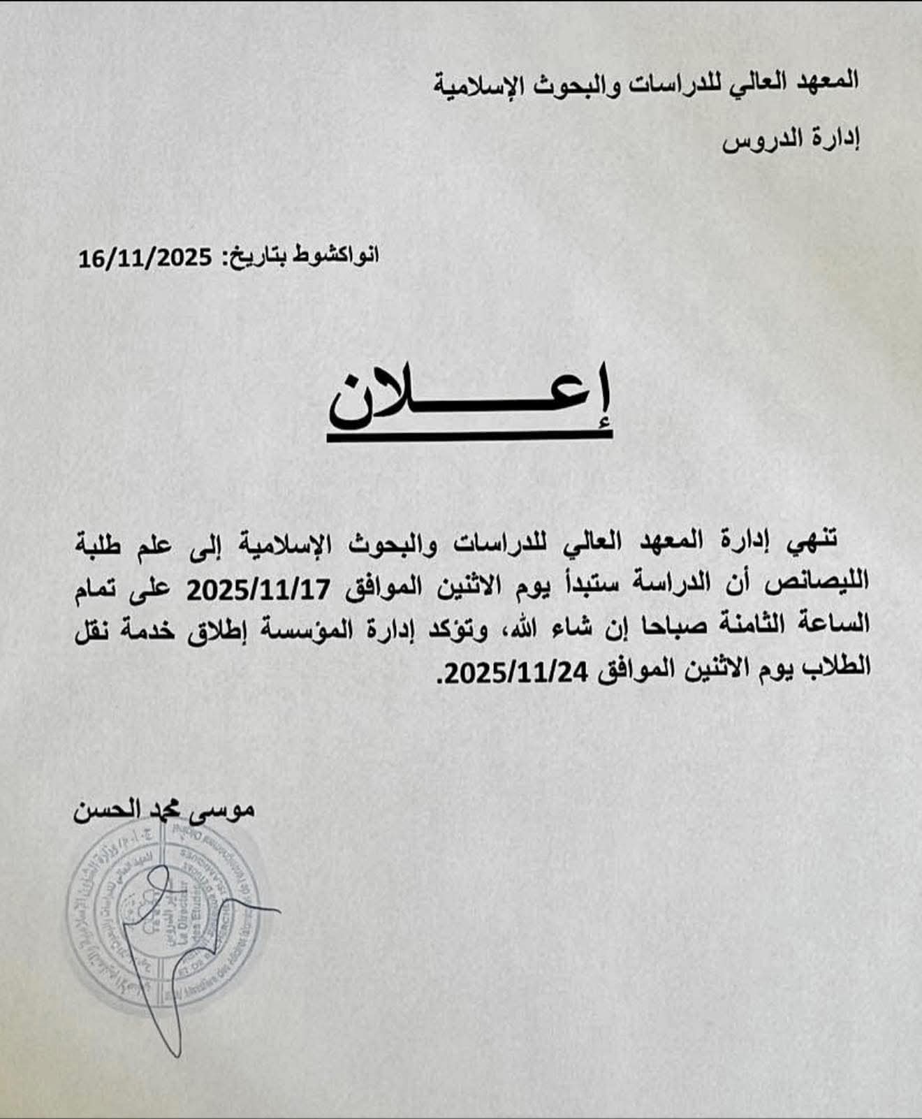 أعلن المعهد العالي للدراسات والبحوث الإسلامية في نواكشوط أن الدراسة ستنطلق يوم الاثنين 17 نوفمبر 2025 عند الساعة الثامنة صباحًا.