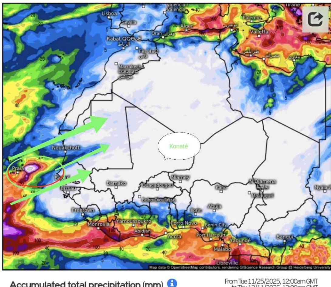 تشير معطيات الأرصاد الجوية، صباح اليوم الثلاثاء، إلى تقدّم سحب ممطرة قادمة من الغرب نحو ولايات الساحل الموريتاني، خاصة اترارزة ونواكشوط، حيث يُتوقع أن تصحبها أمطار خفيفة، وذلك عقب تراجع تأثير التيار الشمالي الشرقي الجاف.