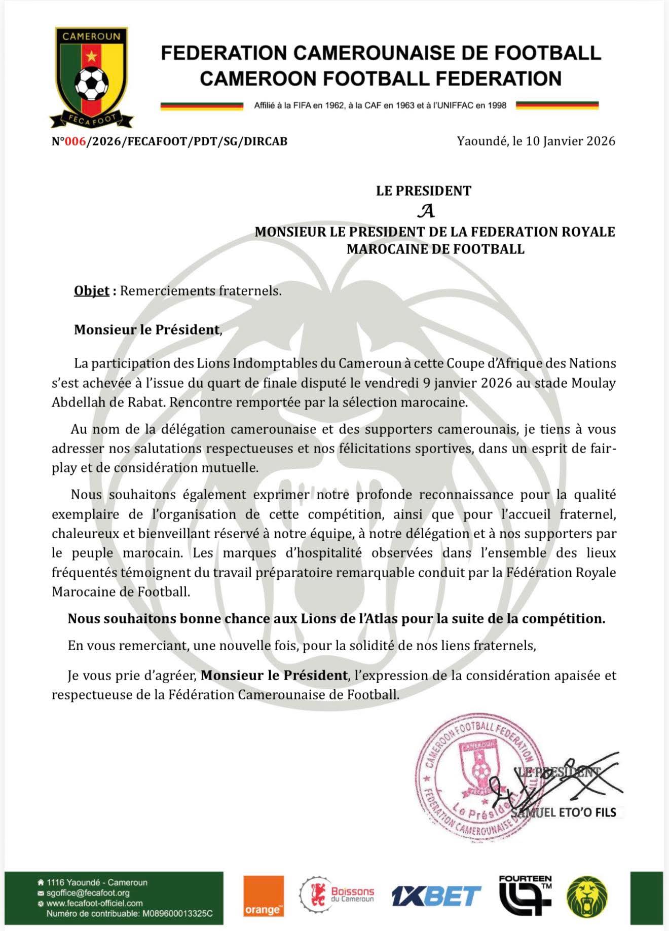 وأعرب الاتحاد، في رسالة موقعة من رئيسه صامويل إيتو، عن تهانيه للمنتخب المغربي، مشيدًا بروح اللعب النظيف والاحترام المتبادل الذي طبع المواجهة، ومتمنيًا التوفيق لـ«أسود الأطلس» في بقية مشوار البطولة.