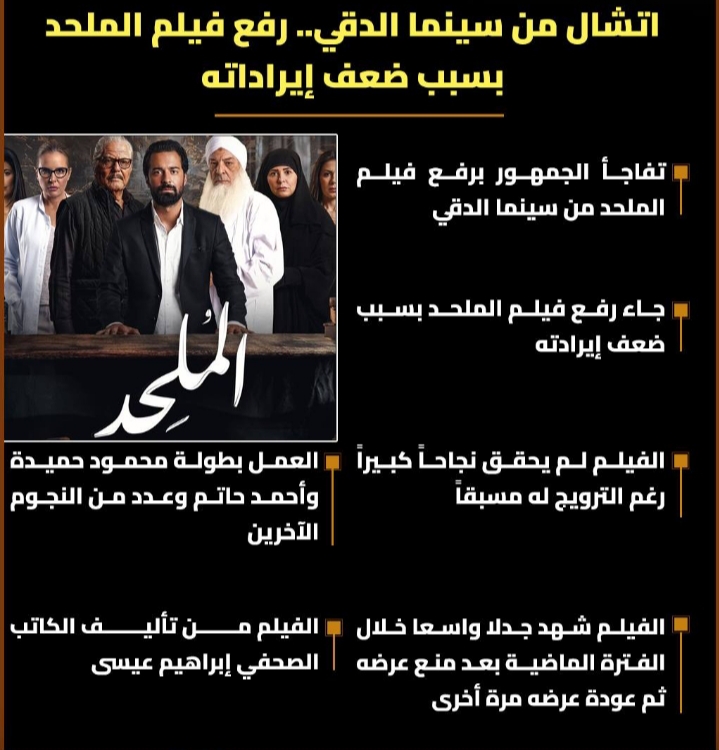 أُعلن عن رفع فيلم «الملحد» من دور السينما بعد تحقيقه إيرادات ضعيفة لم ترقَ إلى مستوى التوقعات، إذ لم تُغطِّ عوائده حتى تكاليف أجر بطل واحد من أبطاله، رغم الحملة الترويجية التي سبقت عرضه.
