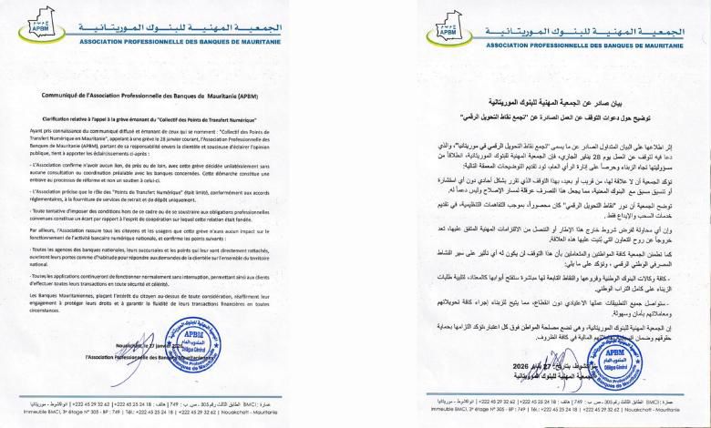 أصدرت الجمعية المهنية لبنوك موريتانيا (APBM) بيانًا توضيحيًا نفت فيه بشكل قاطع أي صلة لها بالدعوة إلى التوقف عن العمل الصادرة عما يسمى “تجمع نقاط التحويل الرقمي في موريتانيا”، والمقرر تنظيمه يوم 28 يناير الجاري.