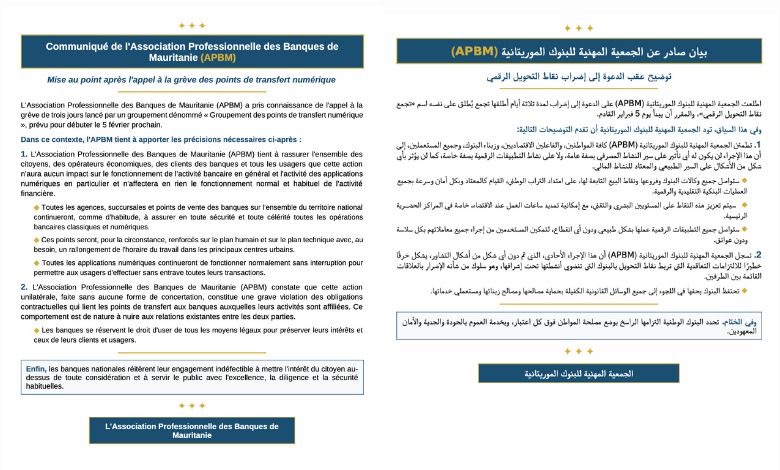 أصدرت الجمعية المهنية للبنوك الموريتانية بيانًا توضيحيًا ردًا على الدعوة إلى إضراب لمدة ثلاثة أيام أطلقها تجمع يطلق على نفسه اسم “APBM”، ويستهدف نقاط التحويل الرقمي ابتداءً من يوم 5 فبراير القادم.
