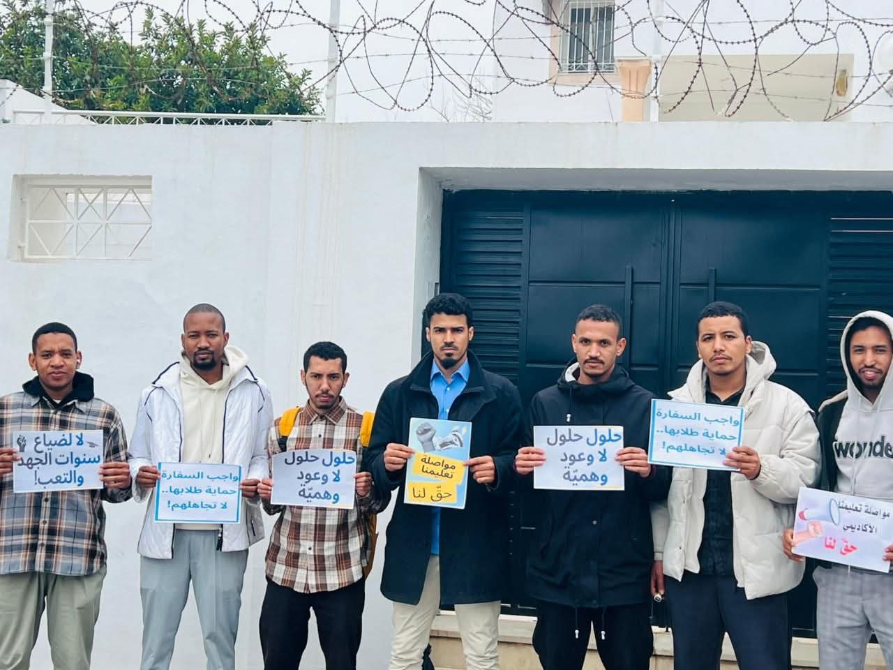 للأسبوع الثالث على التوالي، يواصل عدد من الطلاب الموريتانيين الدارسين في الجمهورية التونسية وقفات احتجاجية أمام مبنى السفارة الموريتانية، مطالبين بتدخل عاجل لإنهاء أزمة التسجيل التي تواجه خريجي الجامعات التونسية، وما نجم عنها من تعطيل لمسارهم الدراسي والمهني.