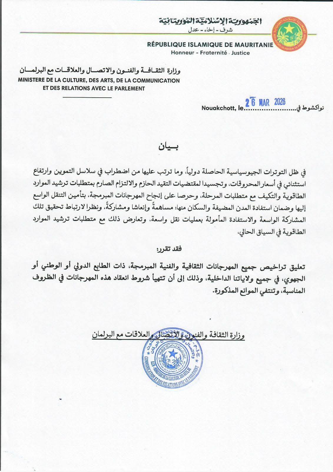 أعلنت وزارة الثقافة والفنون والاتصال والعلاقات مع البرلمان تعليق تراخيص جميع المهرجانات الثقافية والفنية المزمع تنظيمها في الولايات الداخلية، وذلك حتى إشعار آخر.