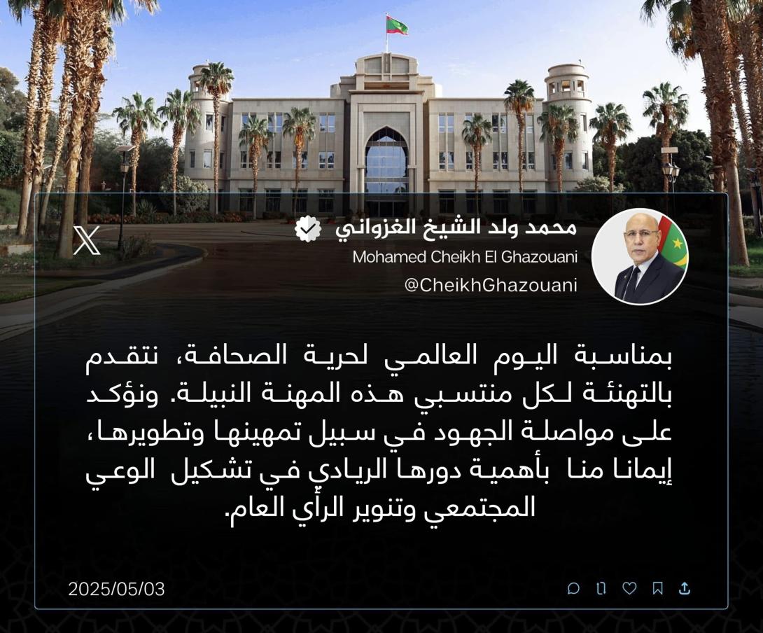 May 02 / التعليقات غزواني يهنئ منتسبي الاعلام بمناسبة اليوم العالمي لحرية الصحافة جمعة, 2025/05/02 - 22:45