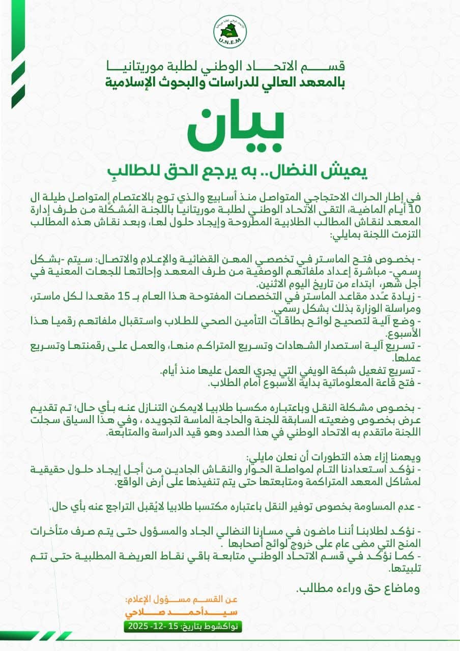 أعلن قسم الاتحاد الوطني لطلبة موريتانيا بالمعهد العالي للدراسات والبحوث الإسلامية التوصل إلى جملة التزامات لمعالجة المطالب الطلابية، عقب نقاشات مع لجنة من إدارة المعهد، في إطار الحراك الاحتجاجي المتواصل.