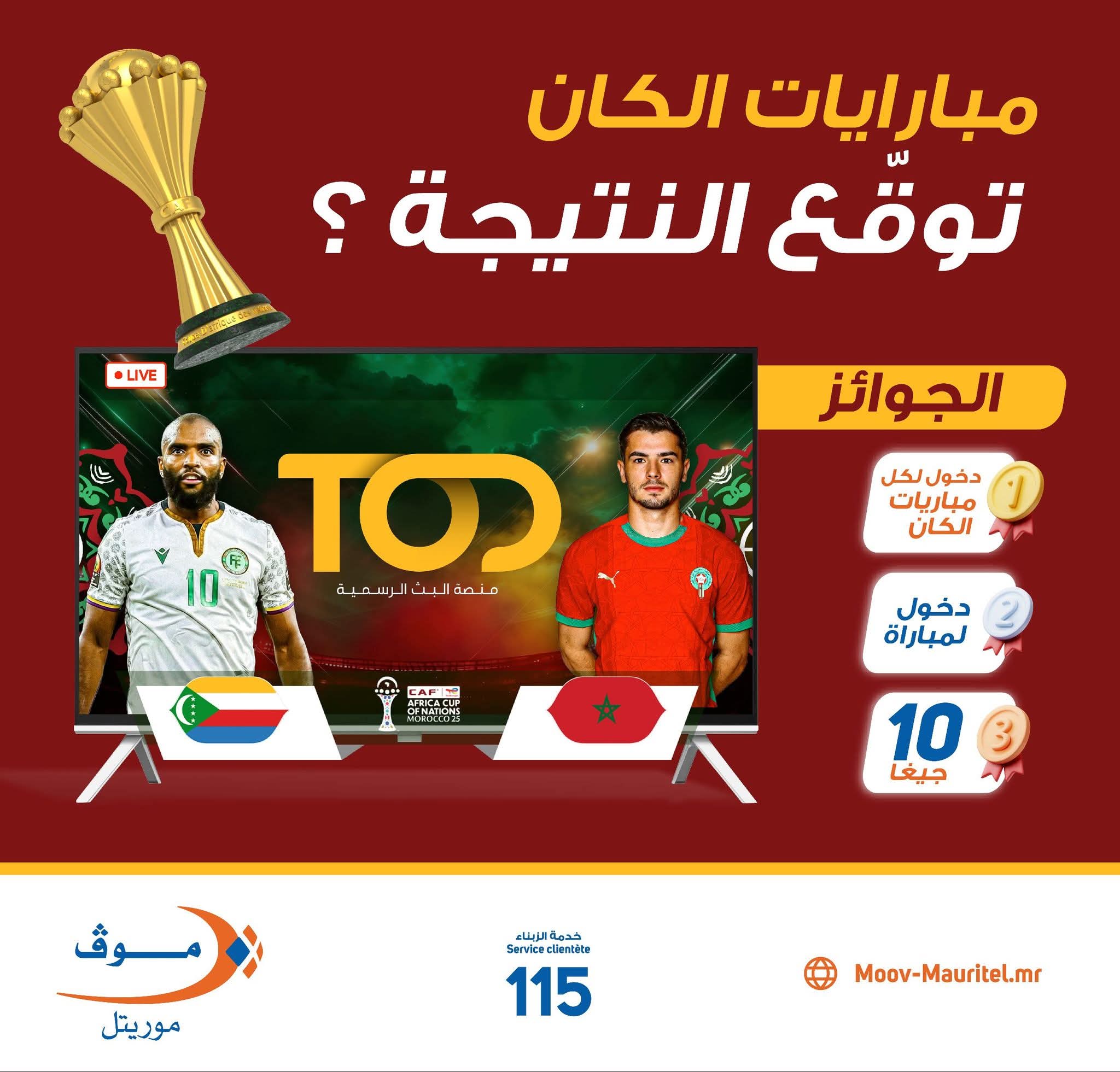 أعلنت شركة موف موريتل عن إطلاق مسابقة تفاعلية بالتزامن مع انطلاق بطولة كأس أمم إفريقيا 2025، تتيح للجمهور فرصة الفوز بجوائز قيّمة عبر توقّع نتيجة مباراة الافتتاح التي تجمع بين المنتخب المغربي ونظيره منتخب جزر القمر.