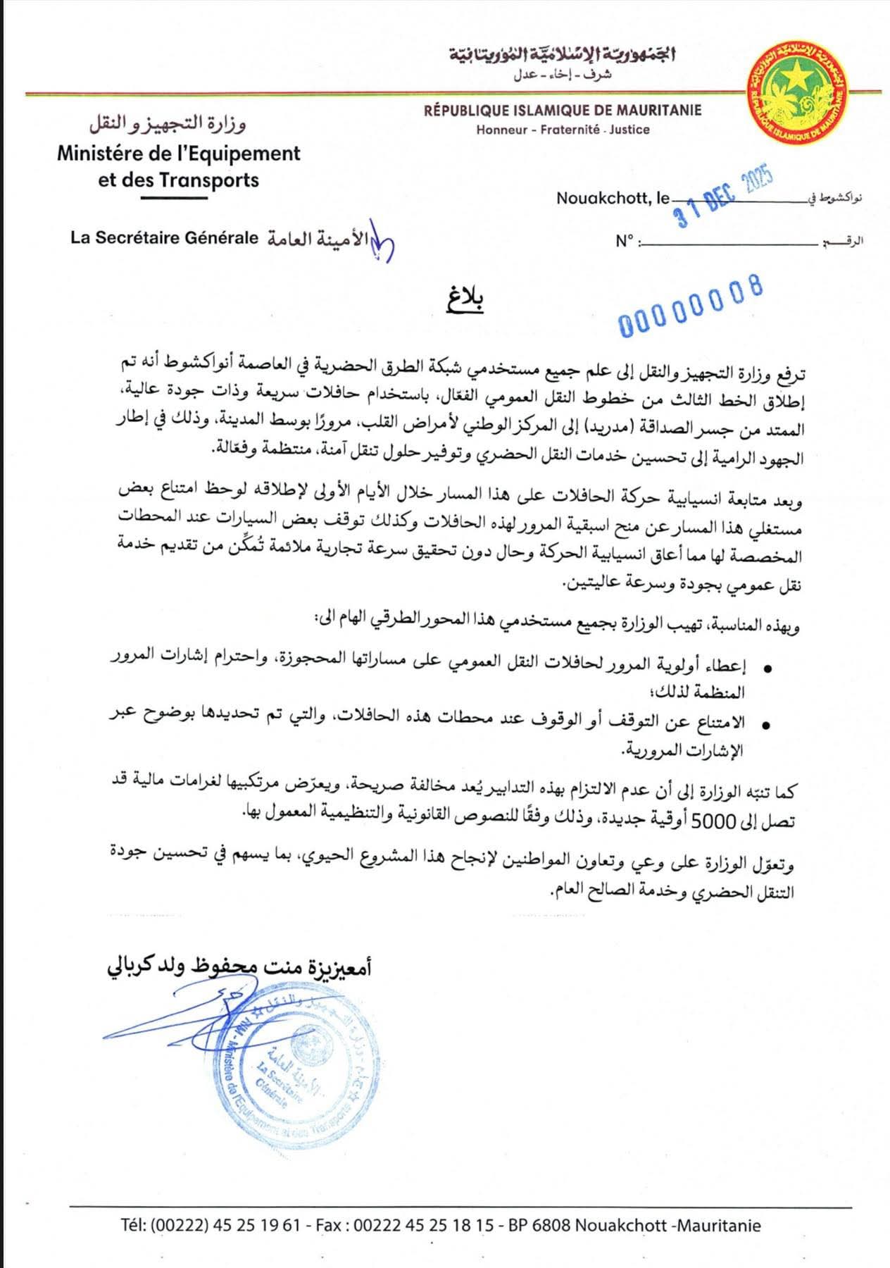 أعلنت وزارة التجهيز والنقل إطلاق الخط الثالث من خطوط النقل العمومي الفعّال في العاصمة نواكشوط، باستخدام حافلات سريعة وذات جودة عالية، تمتد من جسر الصداقة (مدريد) إلى المركز الوطني لأمراض القلب، مرورًا بوسط المدينة.