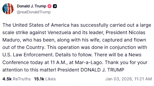 وقال ترمب، في منشور على منصته للتواصل الاجتماعي «تروث سوشيال»، إن العملية نُفذت «بنجاح» وبالتنسيق مع أجهزة إنفاذ القانون الأميركية، مؤكداً أن تفاصيل إضافية سيتم الكشف عنها لاحقاً، مع الإعلان عن عقد مؤتمر صحفي في الساعة 11 صباحاً بمنتجع مارالاغو.