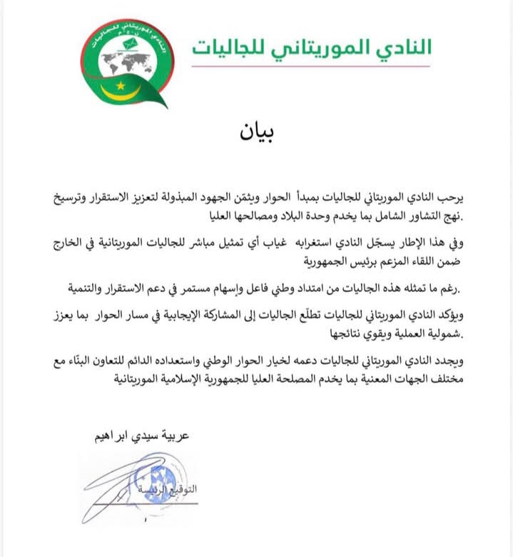 رحّب النادي الموريتاني للجاليات بمبدأ الحوار الوطني، مثمّنًا الجهود المبذولة لتعزيز الاستقرار وترسيخ نهج التشاور الشامل بما يخدم وحدة البلاد ومصالحها العليا.