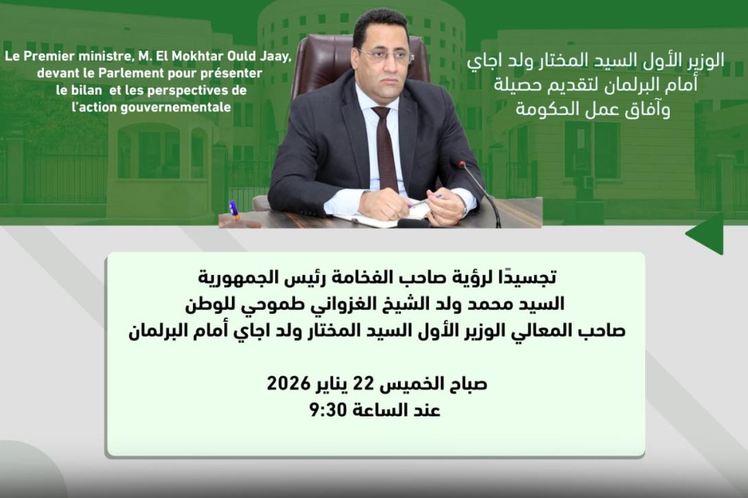 يقدم معالي الوزير الأول المختار ولد اجاي، غداً الخميس، أمام الجمعية الوطنية خلال جلسة علنية، حصيلة عمل الحكومة لسنة 2025، وآفاق برنامجها لسنة 2026.