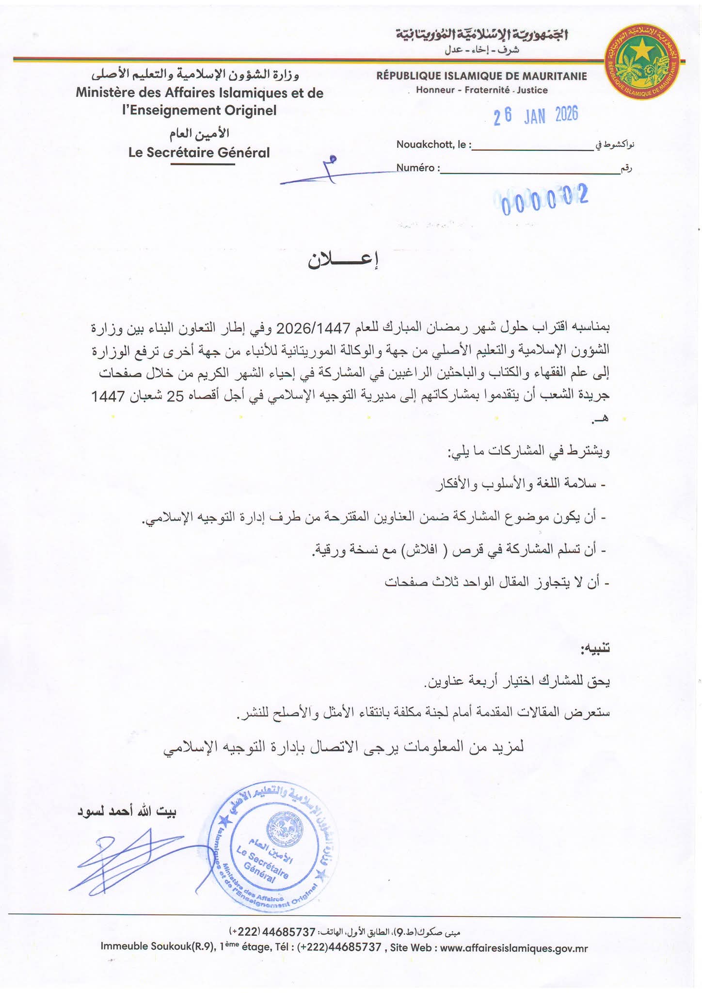 أعلنت وزارة الشؤون الإسلامية والتعليم الأصلي، بالتعاون مع الوكالة الموريتانية للأنباء، فتح باب المشاركات بمناسبة اقتراب حلول شهر رمضان المبارك للعام 1447هـ / 2026م.
