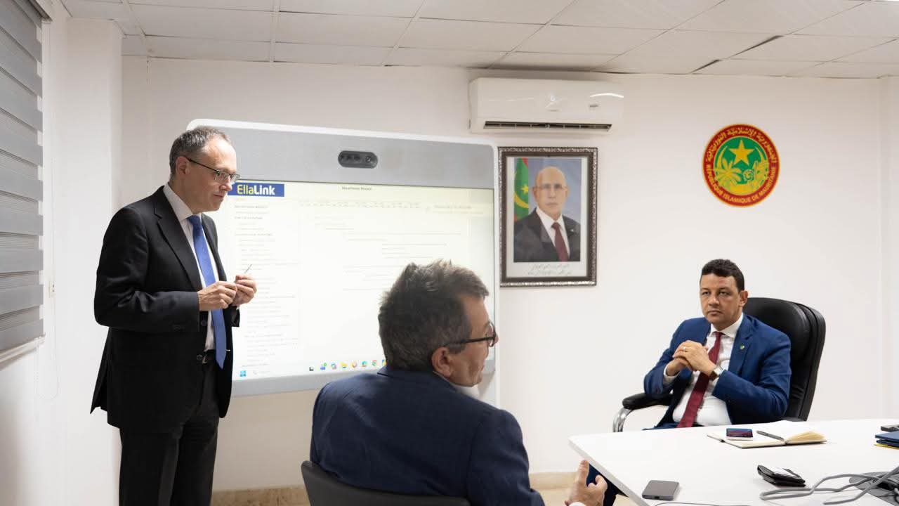 عقد وزير التحول الرقمي وعصرنة الإدارة، السيد أحمد سالم بده، جلسة عمل مع بعثة من شركة EllaLink برئاسة مديرها العام Philippe Dumont، خُصصت لتقييم تقدم أشغال محطة إنزال الكابل البحري الدولي في نواذيبو.