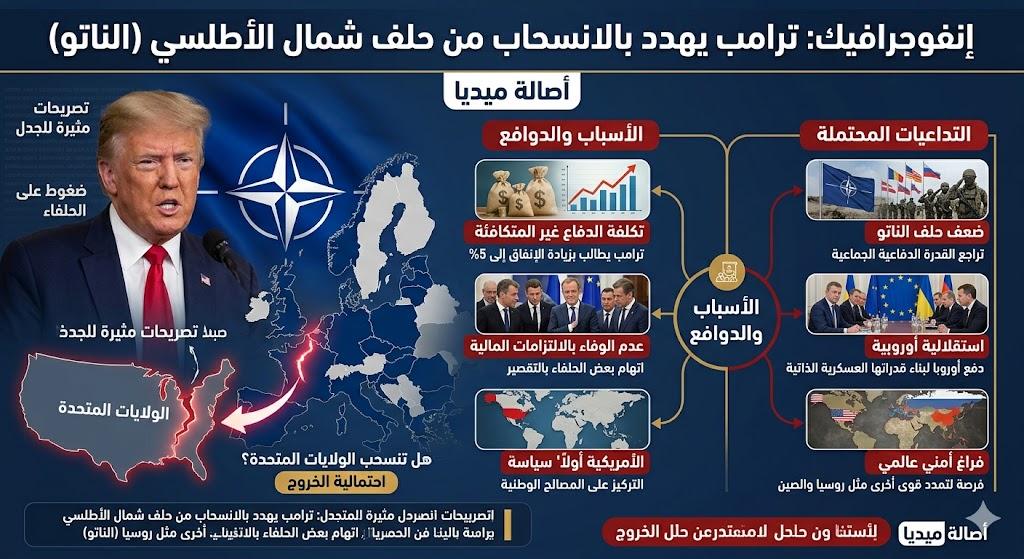 تصاعد التوتر بين الولايات المتحدة وحلفائها في حلف شمال الأطلسي (الناتو)، بعد إعلان الرئيس الأمريكي دونالد ترامب أنه يدرس بجدية انسحاب بلاده من الحلف. وجاءت تصريحاته عقب رفض دول أوروبية إرسال سفن لفتح مضيق هرمز.